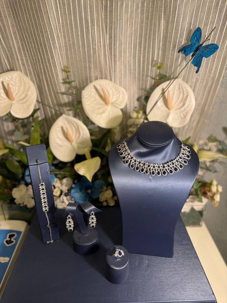 ارتقي بإطلالتك مع هذا الطقم الملكي الكامل المصمم بعناية، والمرصّع بأحجار الأماتيست الكحلي الفاخر.